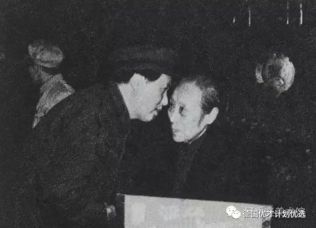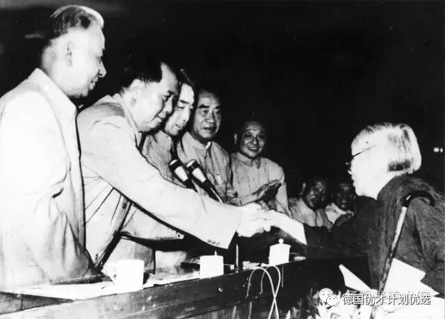 1961年6月30日,毛泽东同何香凝亲切握手。左起:刘少奇、毛泽东、周恩来、朱德、邓小平