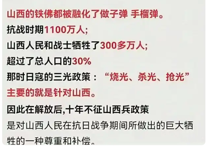 “十年不征山西兵”源于抗战时期山西军民惨烈的牺牲。1937-1945年,山西作为华北抗战主战场,以全省1/4人口(约300万)的代价牵制日军,每4个山西人就有1人牺牲。