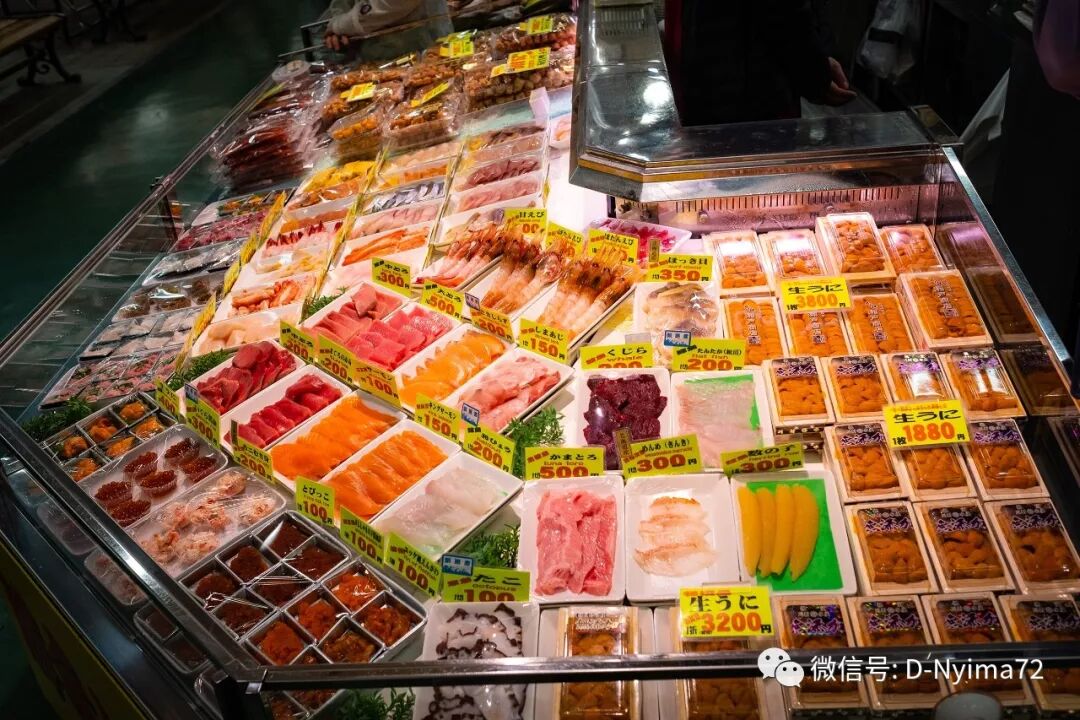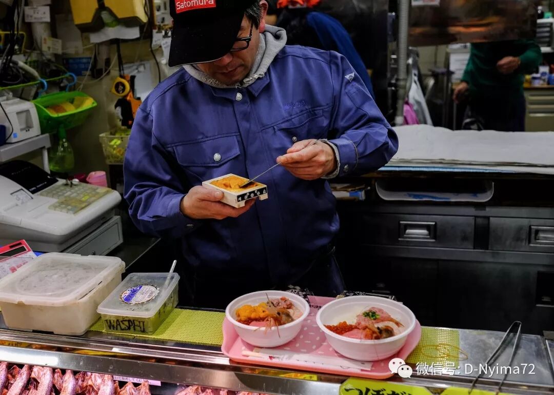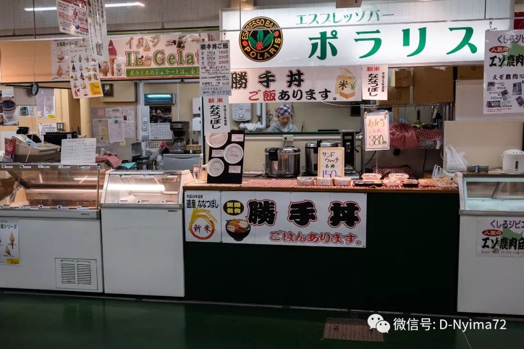 市场里有很多海鲜的摊位,这个季节多是卖北海道春鲑的。口舌的欲望让我无暇顾这些闪亮的海货,花180日元买1份中碗米饭,兴匆匆地跑到配胜手丼的柜台大快朵颐,早就做过扎实功课的我是不会浪费哪怕1分钟的。
