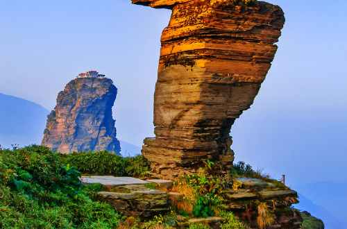 梵净山红云金顶石峰高达九十四米,挺拔峻峭,象一个巨大的擎天石柱拔地而起。它与月镜山南北相望,形成两峰对峙之势,景致极其壮观。金顶石峰下临深壑,百里以外遥望,如玉笋插天。