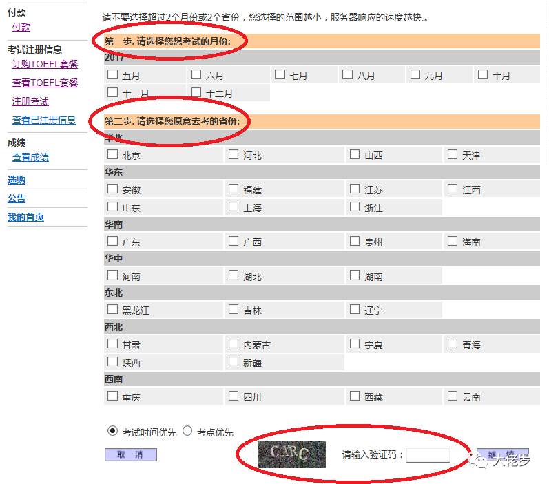 8、选择你想参加考试的月份与省份。若你所在省的考位非常紧张,可以考虑临近省份考试。然后输入验证码,点击“继续”