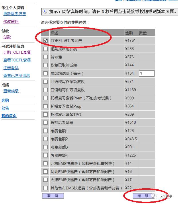 5、进入充值页面后,在“TOEFL IBT 考试费”前点击选择,然后点击“继续”