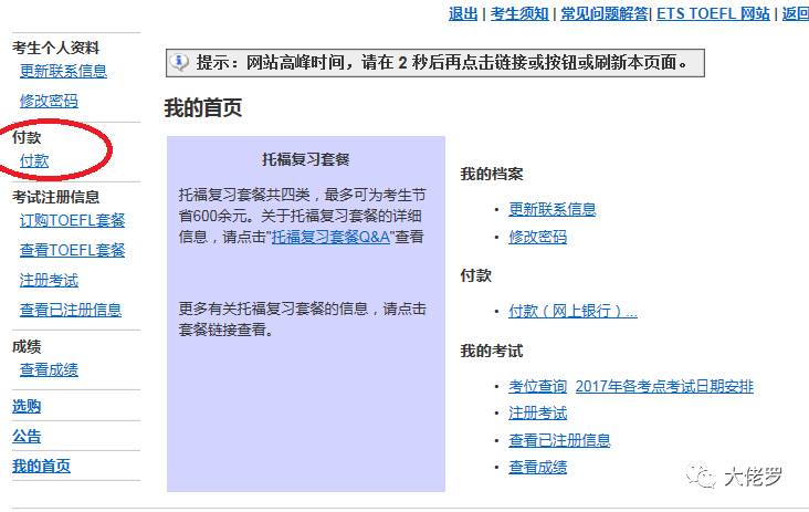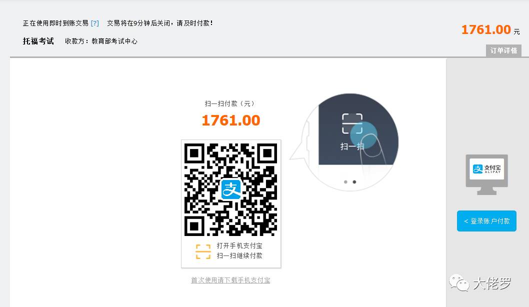 4、此时你的账户余额至少可以报名一次TOEFL考试(¥1761元),否则无法注册考试或查询考位。如果账户中没有余额,需要先点击“付款”进行充值。