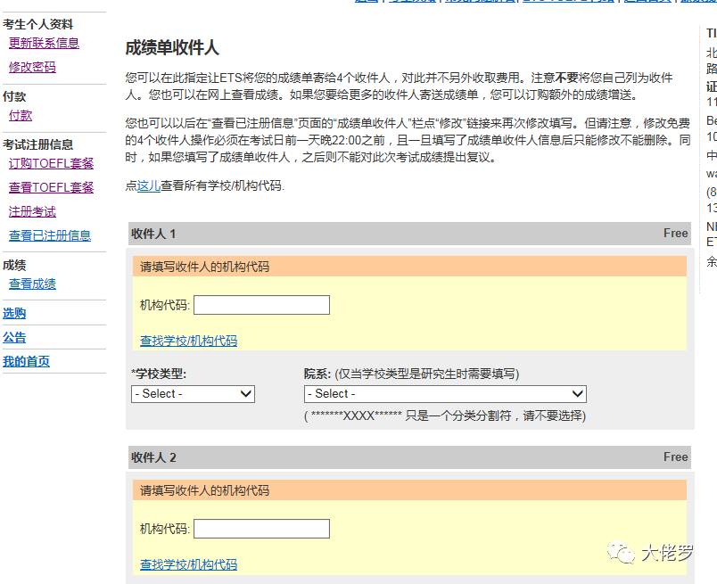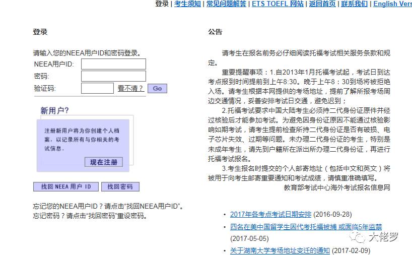 3、如果有TOEFL考试的账号,直接在NEEA出输入ID与密码即可,如果还没有账号,则点击“现在注册”,注册时需要你的姓名,地址,邮编、生日、电话及邮箱。注册完成之后主界面如下: