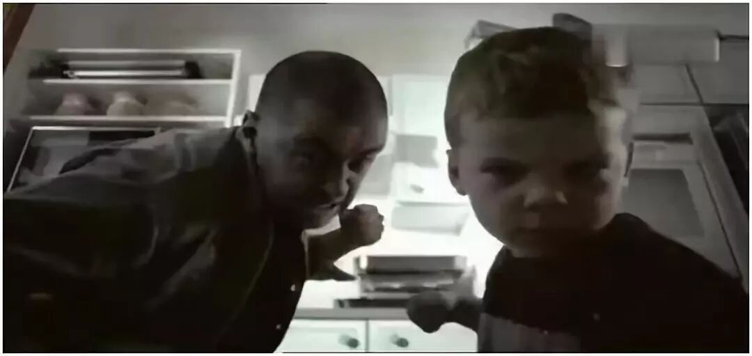 父亲对人大呼小叫,握着拳头威吓他人,年幼的孩子也做出同样恶狠狠地表情与威胁动作;