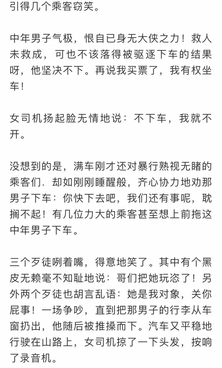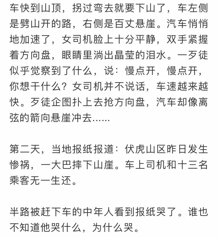 我为女司机而哭,人格的尊严神圣不可侵犯!当一介弱质在淫威之下,无力保住身体的贞洁,她选择了以死亡来捍卫生命的圣洁。宁为碎玉,不为全瓦!悲哉,壮哉!世间奇女子,我为你的刚烈而哭!