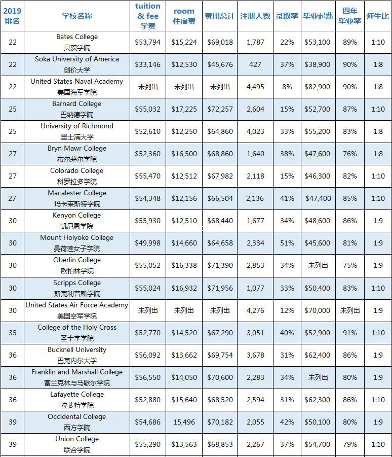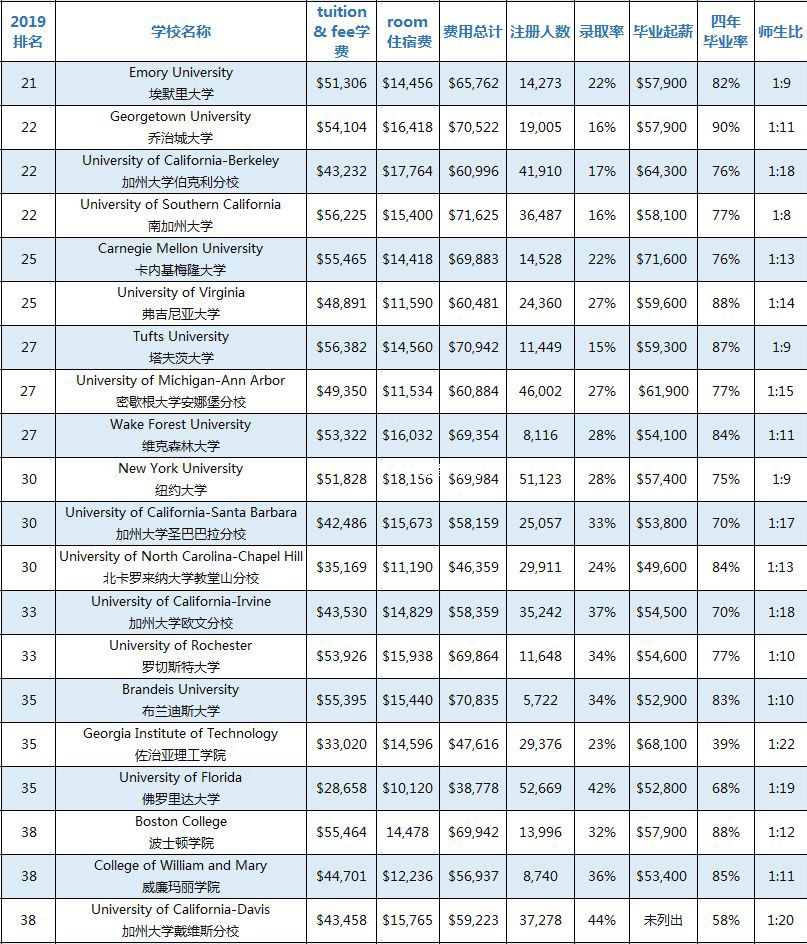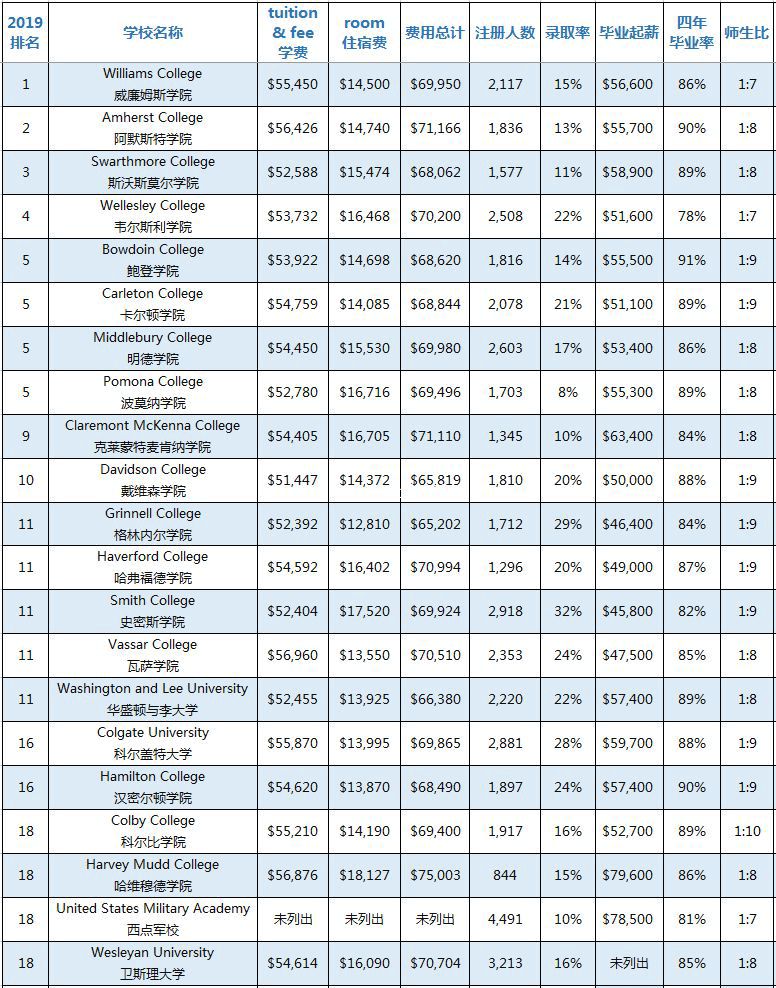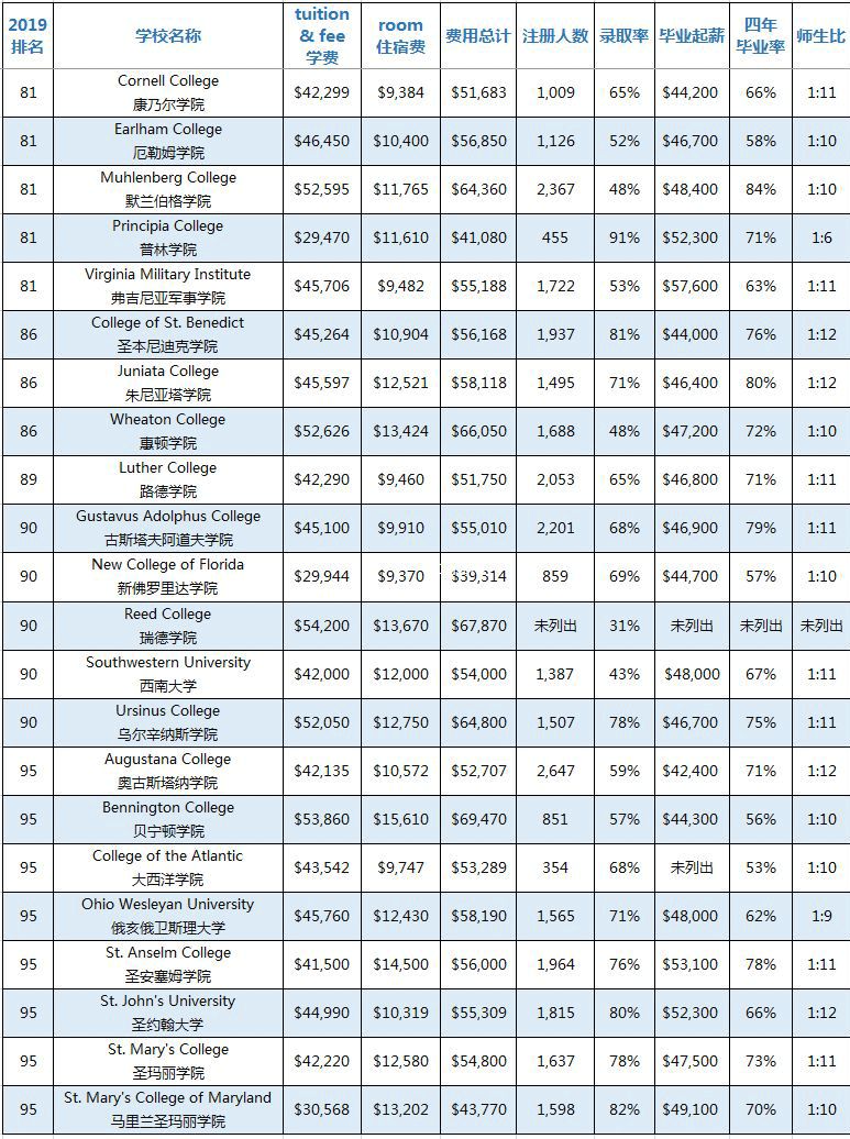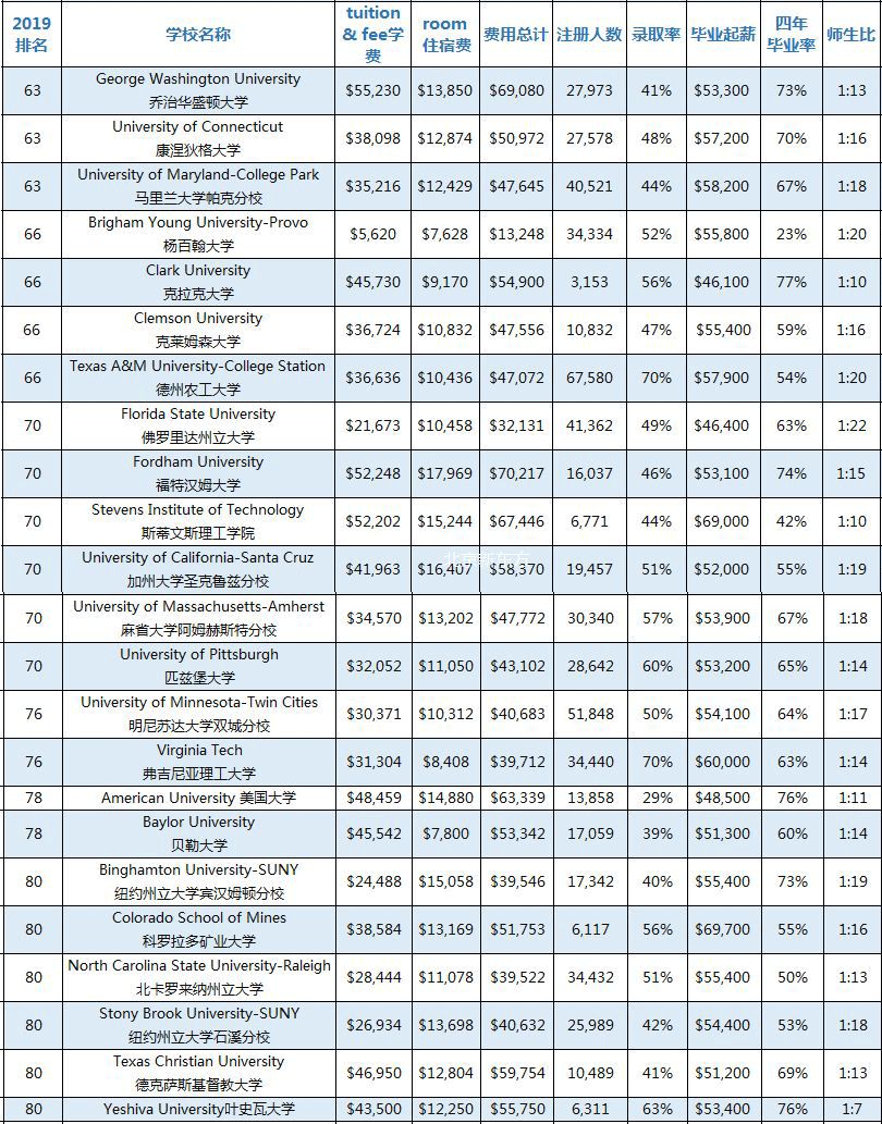 《美国新闻和世界报道》(USNEWS)官方网站历年都会发布一次2019美国综合性大学和文理学院的排名总汇。为了方便家长们为孩子选择合适的美国大学,我将USNEWS网站发布的美国前100名综合性大学和文理学院的招生信息进行了完整的汇总,其中包括学费、住宿费、费用总计、本科注册人数、录取率、毕业生中位数起薪、四年毕业率、师生比这8大类信息,供家长们参考。