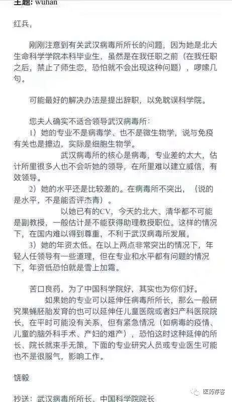 同时抄送武汉病毒所所长王延轶(舒红兵夫人)、中科院院长白春礼。