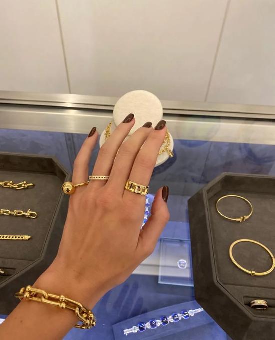 冬天最适合的就是酒红色的指甲油了,显手白还有高级感。手上的配饰呢可以尝试一下各种黄金配饰,象征着新的一年红红火火。多款戒指一起搭配起来戴,是潮流女孩儿的象征哦。