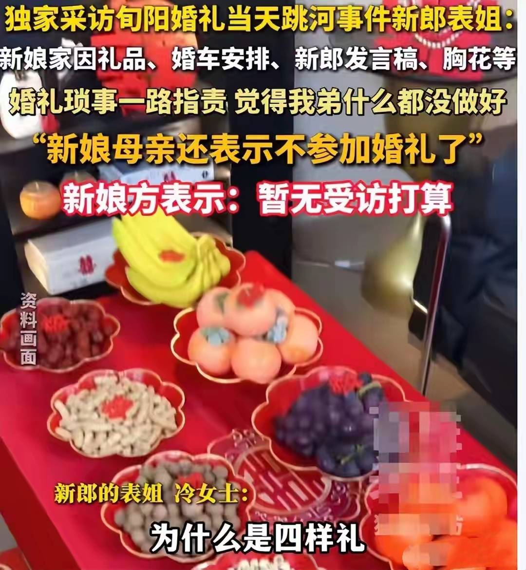 根据新郎的表姐反馈,男方这边去接亲的时候,因为8件礼品少了4样这件事,接亲的人差点和女方的家属打起来。