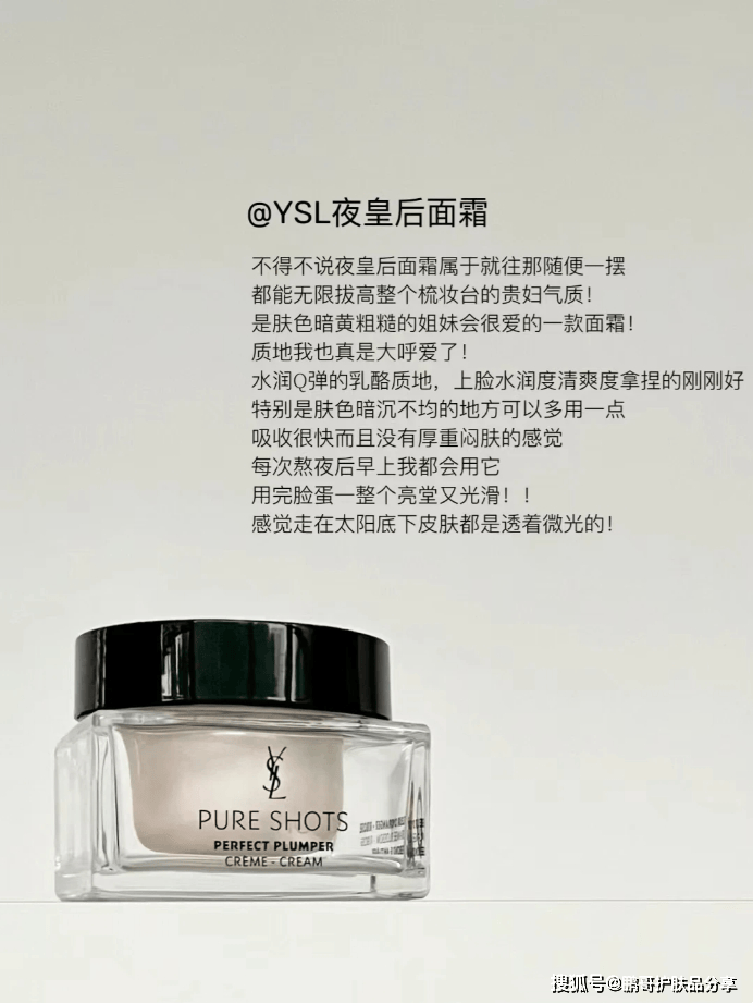 和夜皇后精华相比,同系列的面霜显得低调了很多,但使用感毫不逊色,滋养皮肤或者是淡化纹路都不错,嫩豆腐质地还蛮特别的,也是需要乳化再按压上脸。