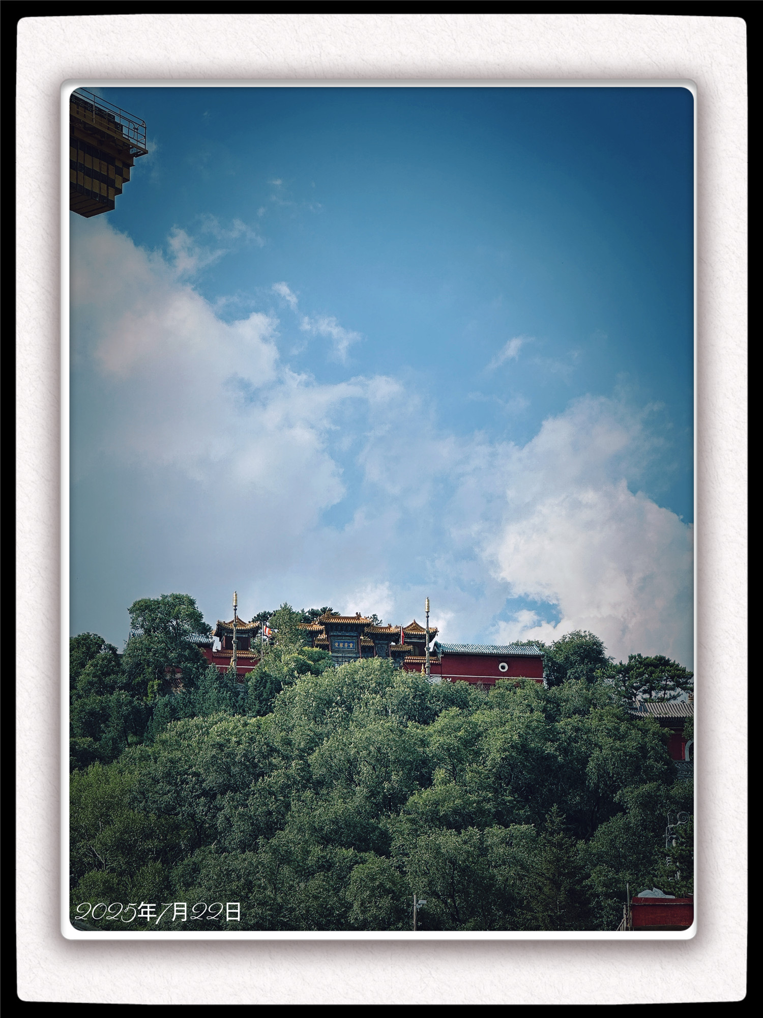 从山脚仰望,在湛蓝的天幕下,一缕缕白云掠过,一丛丛红墙黄瓦的寺院,光芒闪烁,宛若漂浮在云间的天上宫阙;自山顶俯瞰,在浓淡起伏的绿海里,一座座高低不同的白塔,一幢幢金黄、绛jiàng红的庙宇就像闪耀在绿波中的海市蜃楼。你会不由自主地感叹:五台归来不看庙!
