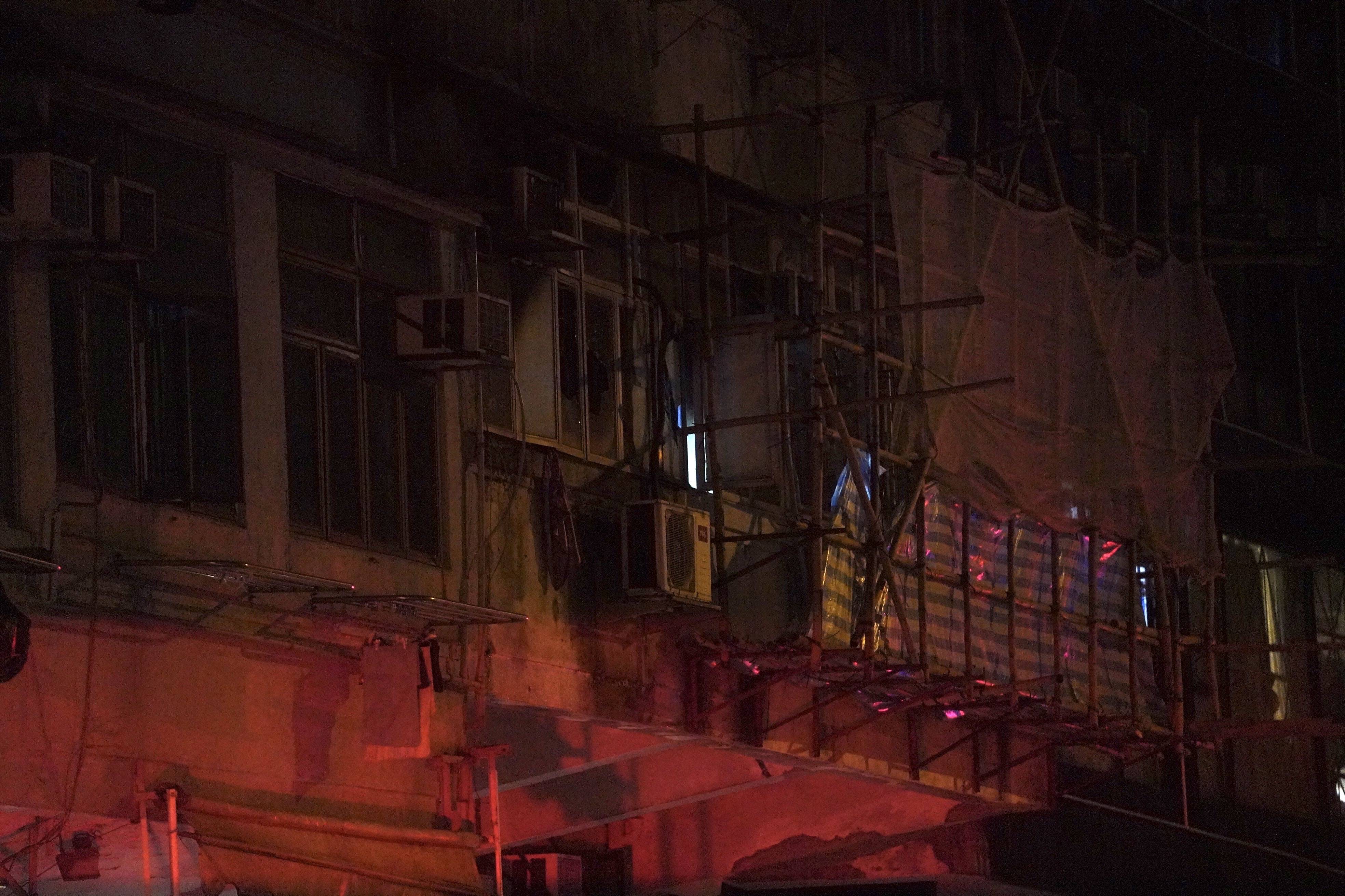 自去年大维修工程开始便包围大楼的竹棚和棚网,不仅帮助火势蔓延,也给救援造成困难。