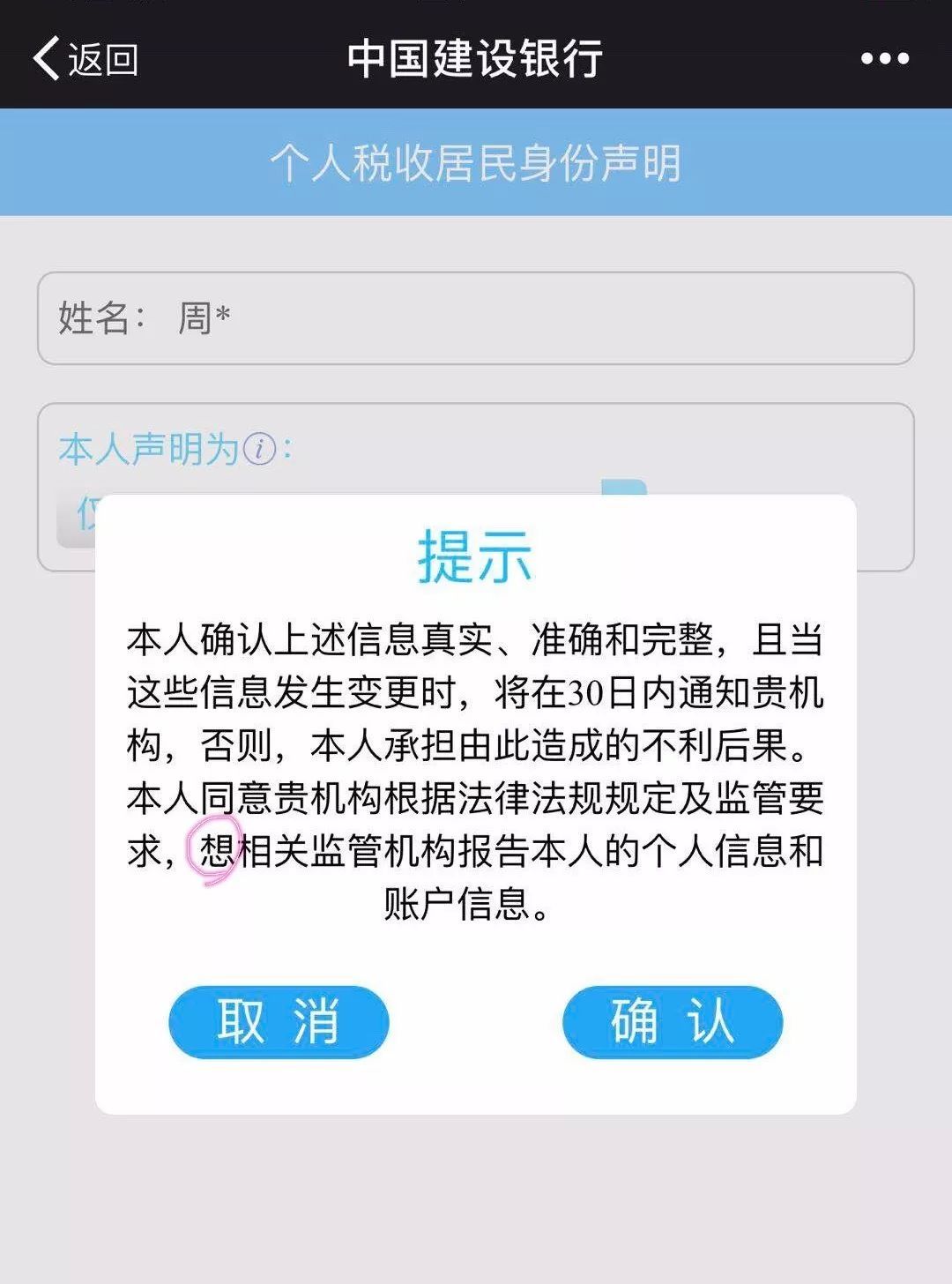 插一句题外话,报告亲爱的建行,你们家个人税收居民身份声明最后确认提交的提示弹窗里,有个错别字!!