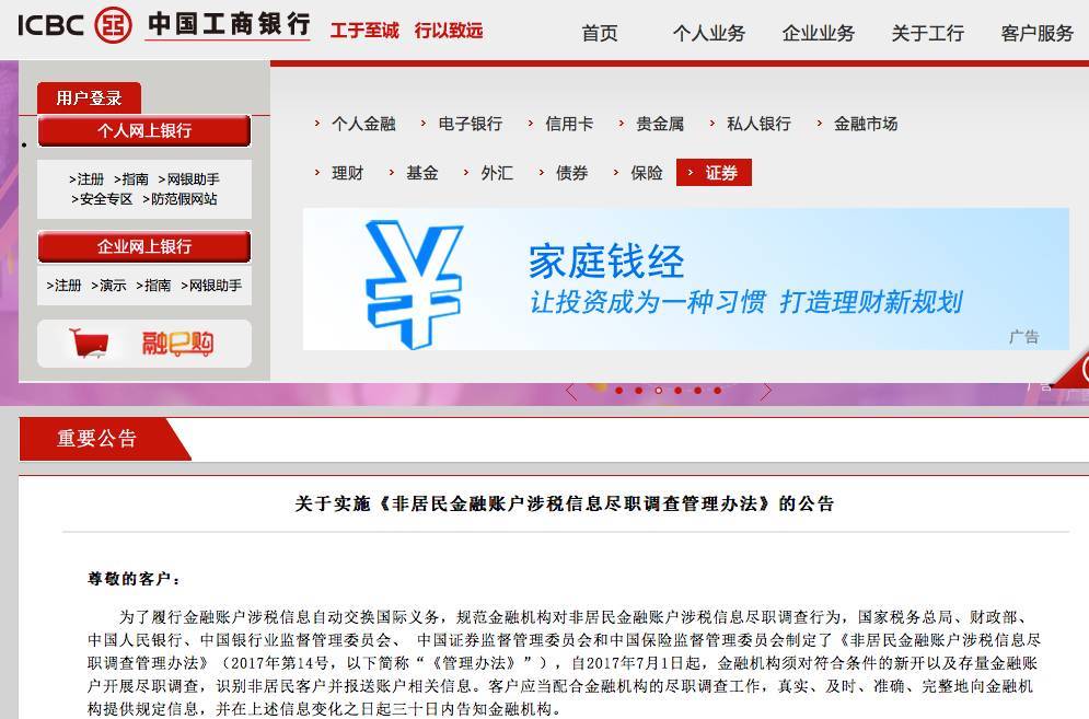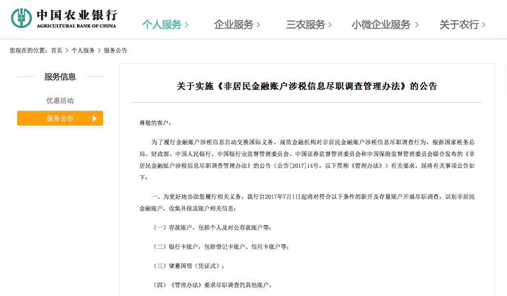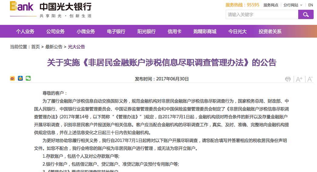 另外,包括工农中建、中信在内的十余家银行,已对公众刊出公告,要求存量非居民客户(即于今年7月1日前在银行开立过存款账户、银行卡、国债等的客户),从柜面或手机银行等签署税收居民身份声明文件。