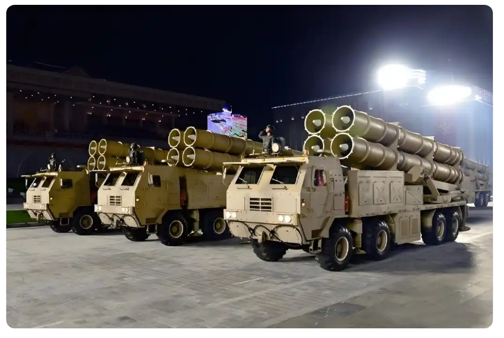 营造视觉冲击力:通过精心设计的灯光布局,朝鲜在黑夜中构建出极具戏剧张力的视觉场景。聚光灯聚焦于导弹等重型装备,勾勒出冷峻而庞大的轮廓,在黑暗背景的映衬下形成强烈的视觉压迫感,强化观众的心理震撼。