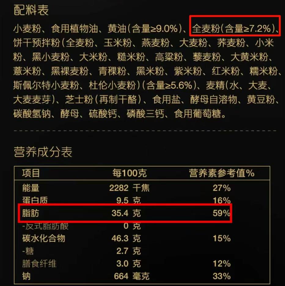 像下面这款所谓的全麦饼干,脂肪含量高达35.4%,全麦粉含量不到10%,主料其实是精制小麦粉。